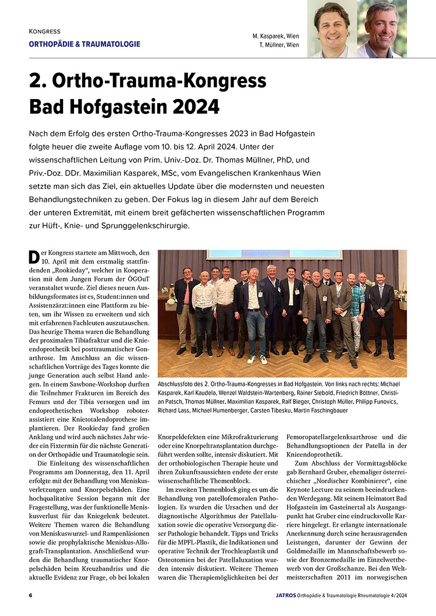 Nach dem Erfolg des ersten Ortho-Trauma Kongresses 2023 in Bad Hofgastein folgte heuer die zweite Auflage vom 10. bis 12. April 2024. Unter der wissenschaftlichen Leitung von Prim. Univ.-Doz. Dr. Thomas Müllner, PhD und Priv.-Doz. DDr. Maximilian Kasparek, MSc vom Evangelischen Krankenhaus Wien setzte man sich das Ziel, ein aktuelles und interessantes Update über die modernsten und neuesten Behandlungstechniken zu geben. Der Fokus lag in diesem Jahr im Bereich der unteren Extremität, mit einem breit gefächerten wissenschaftlichen Programm zur Hüft-, Knie- und Sprunggelenkschirurgie.
